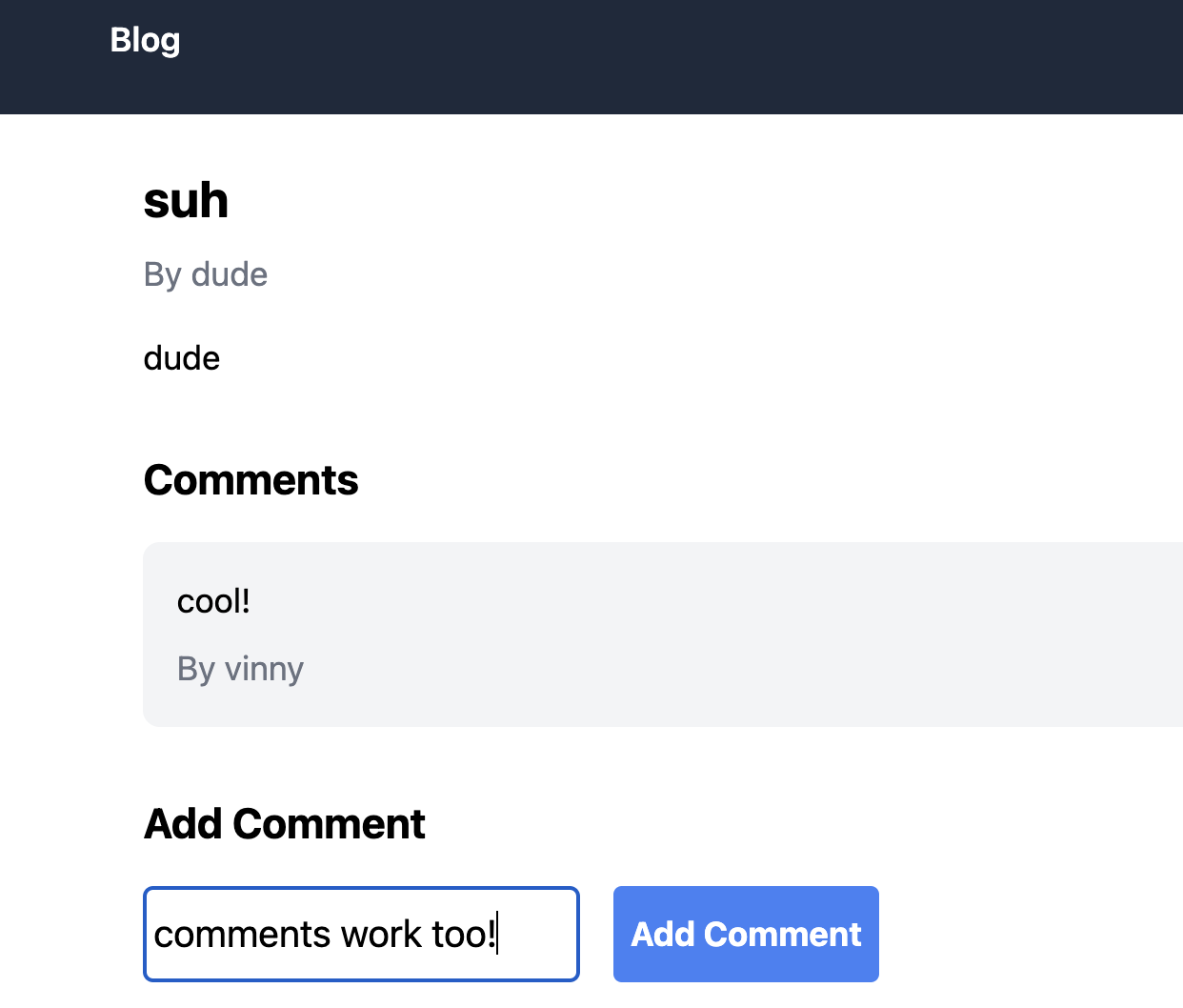 And with those simple fixes we got a fully functioning, full-stack blog app with authentication, database, and simple tailwind css styling! The best part was that all this took about ~5 minutes from start to finish. Sweet :)